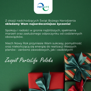 Drodzy Klienci, Współpracownicy oraz Przyjaciele Partslife Polska Z okazji nadchodzących Świąt Bożego Narodzenia składamy Wam najserdeczniejsze życzenia!     Spokoju i radości w gronie najbliższych, spełnienia marzeń oraz zasłużonego odpoczynku od codziennych obowiązków.     Niech Nowy Rok przyniesie Wam sukcesy, pomyślność oraz niekończącą się energię do realizacji Waszych planów – zarówno zawodowych, jak i osobistych!